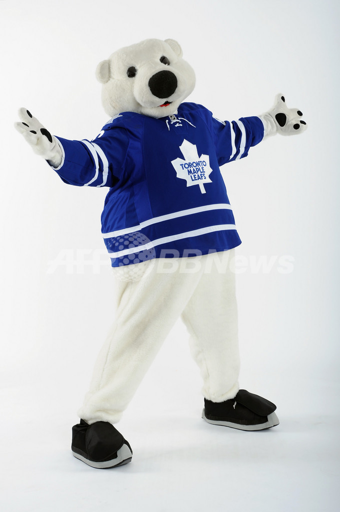 写真撮影でポーズをとるトロント・メイプルリーフス(Toronto Maple Leafs)のカールトン・ザ・ベアー(Carlton the Bear、2012年1月26日撮影)。(c)AFP/Getty Images/Freestyle Photo/Matt Zambonin