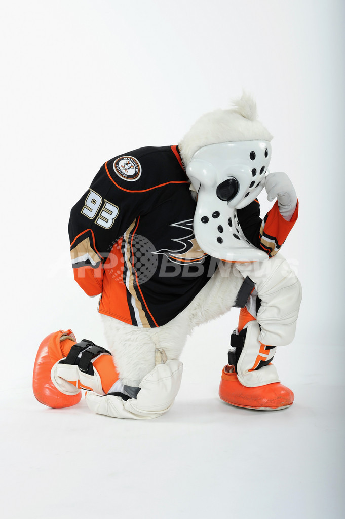 写真撮影でポーズをとるアナハイム・ダックス(Anaheim Ducks)のワイルドウィング(Wild Wing、2012年1月26日撮影)。(c)AFP/Getty Images/Freestyle Photo/Matt Zambonin