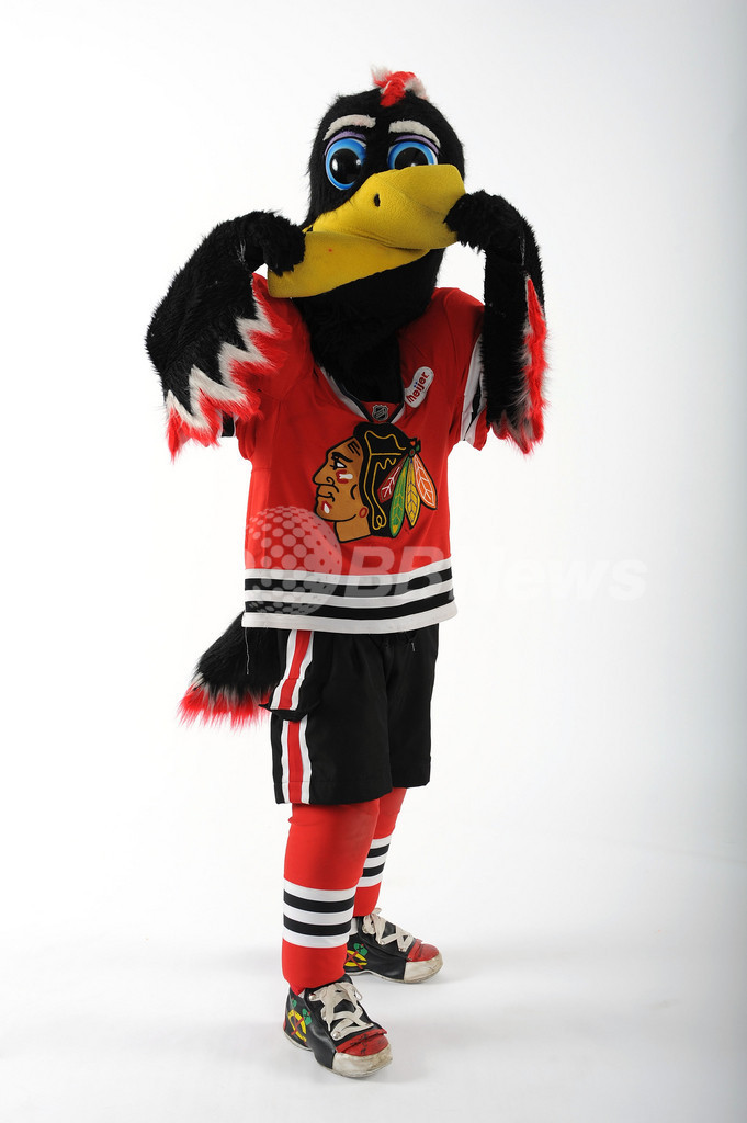 写真撮影でポーズをとるシカゴ・ブラックホークス(Chicago Blackhawks)のトミー・ホーク(Tommy Hawk、2012年1月26日撮影)。(c)AFP/Getty Images/Freestyle Photo/Matt Zambonin