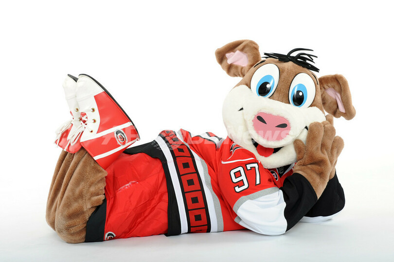 写真撮影でポーズをとるカロライナ・ハリケーンズ(Carolina Hurricanes)のストーミー(Stormy、2012年1月26日撮影)。(c)AFP/Getty Images/Freestyle Photo/Matt Zambonin
