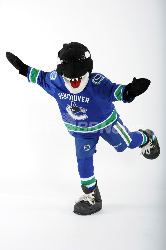 写真撮影でポーズをとるバンクーバー ・カナックス(Vancouver Canucks)のフィン(Fin、2012年1月26日撮影)。(c)AFP/Getty Images/Freestyle Photo/Matt Zambonin