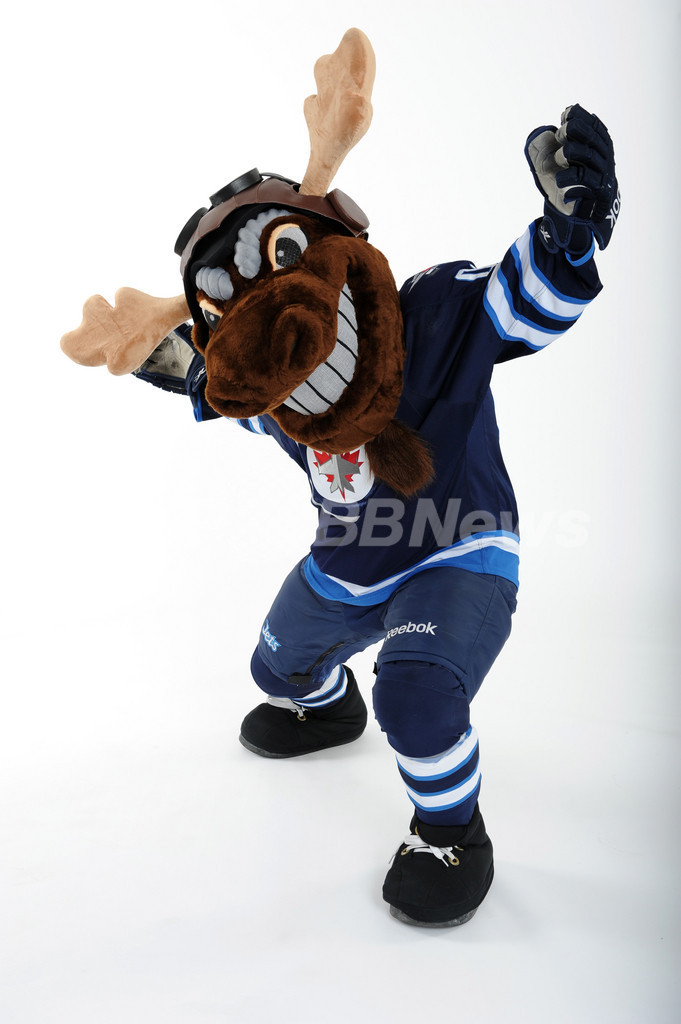 写真撮影でポーズをとるウィニペグ・ジェッツ(Winnipeg Jets)のミック・E・ムース(Mick E. Moose、2012年1月26日撮影)。(c)AFP/Getty Images/Freestyle Photo/Matt Zambonin