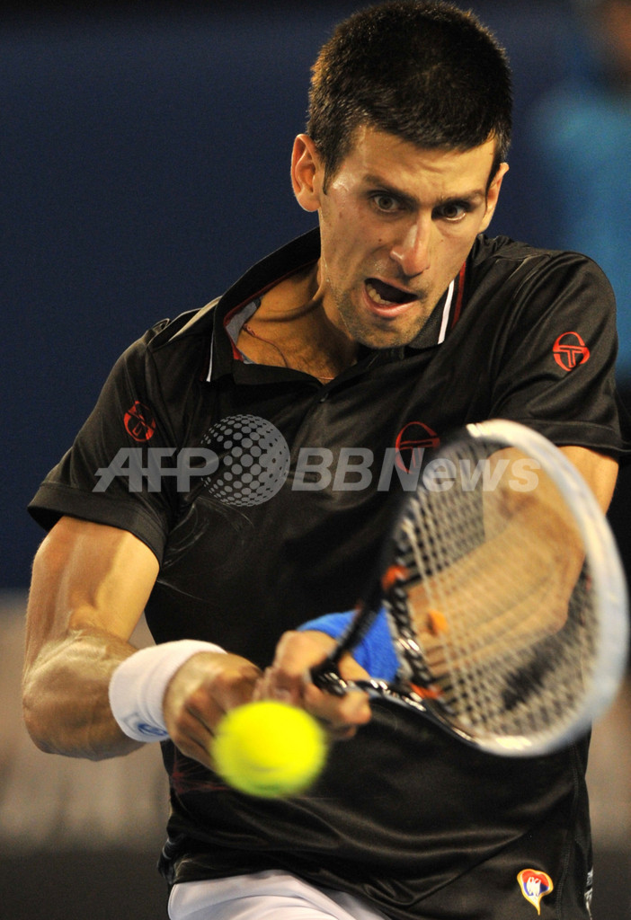 リターンを打つノバク・ジョコビッチ(2012年1月29日撮影)。(c)AFP/PAUL CROCK