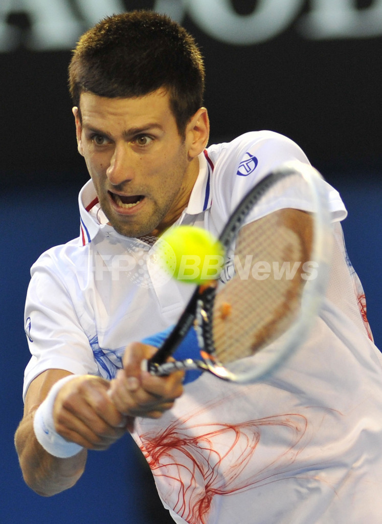 リターンを打つノバク・ジョコビッチ(2012年1月29日撮影)。(c)AFP/NICOLAS ASFOURI