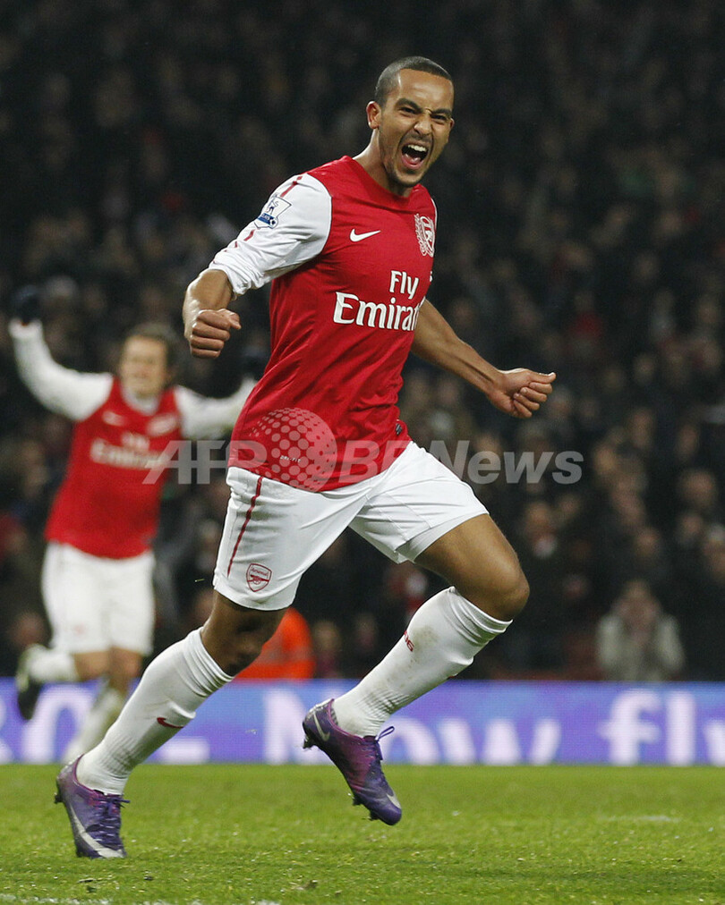 後半12分にチーム2得点目を挙げて歓喜するアーセナルのテオ・ウォルコット(Theo Walcott、2012年1月29日撮影)。(c)AFP/IAN KINGTON