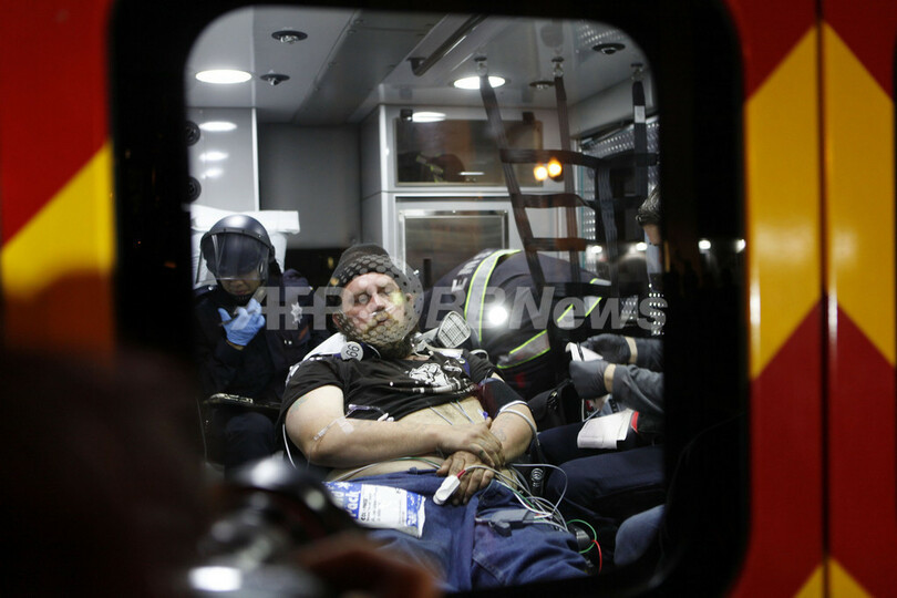 写真は、逮捕されたあと、救急車内で治療を受けるデモ参加者(2012年1月28日撮影)。(c)AFP/Kimihiro Hoshino