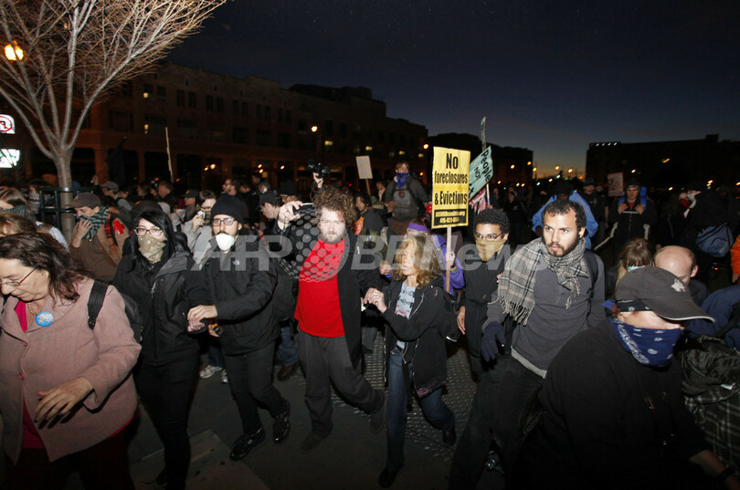 1000人余りが参加した「オキュパイ・オークランド(オークランドを占拠せよ、Occupy Oakland)」のデモは、当初は平穏に行われていたが、警察発表によると一部が暴徒化。警官を瓶や金属棒で殴ったり、石や手製の爆発物を投げたり、放火するなどしたため、警察側も催涙弾やビーンバッグ弾などで応じた。この衝突で、警官3人とデモ参加者1人が負傷したという。(c)AFP