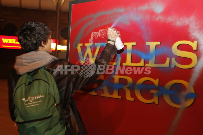 写真は、米銀行大手ウェルズ・ファーゴ(Wells Fargo)の看板に落書きするデモ参加者(2012年1月28日撮影)。(c)AFP/Kimihiro Hoshino