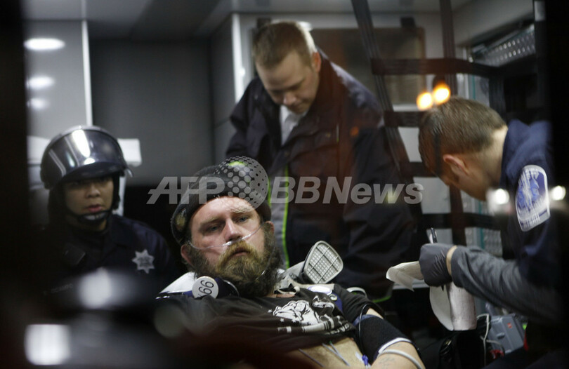 1000人余りが参加した「オキュパイ・オークランド(オークランドを占拠せよ、Occupy Oakland)」のデモは、当初は平穏に行われていたが、警察発表によると一部が暴徒化。警官を瓶や金属棒で殴ったり、石や手製の爆発物を投げたり、放火するなどしたため、警察側も催涙弾やビーンバッグ弾などで応じた。この衝突で、警官3人とデモ参加者1人が負傷したという。(c)AFP