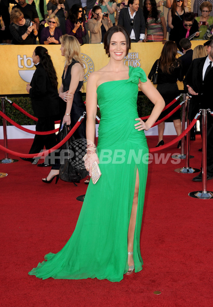 第18回映画俳優組合(Screen Actors Guild、SAG)賞授賞式が29日、米ロサンゼルス(Los Angeles)で開催され、豪華スターがレッドカーペットを彩った。写真は、女優エミリー・ブラント(Emily Blunt、2012年1月29日撮影)。(c)AFP/Getty Images/Jason Merritt