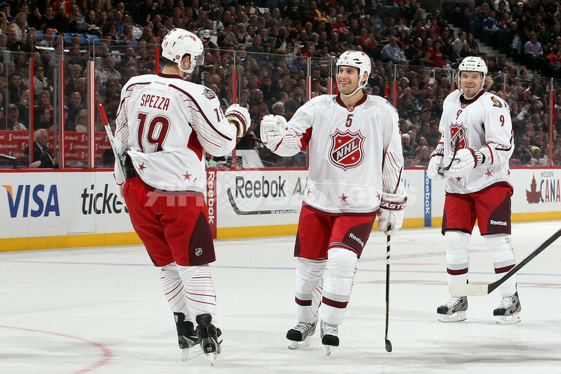 第1ピリオドで得点し、チームメイトのダン・ジラーディ(Dan Girardi、中央)と喜びを分かち合うチーム・アルフレッドソンのジェイソン・スピーザ(Jason Spezza、2012年1月29日撮影)。(c)AFP/Getty Images/Christian Petersen