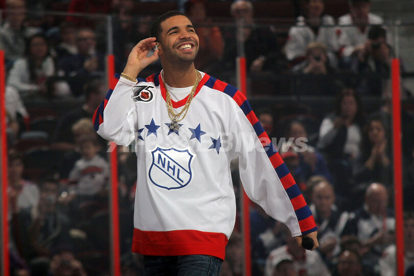 インターミッション中にパフォーマンスを披露するヒップホップアーティストのドレイク(Aubrey Drake Graham、2012年1月29日撮影)。(c)AFP/Getty Images/Bruce Bennett