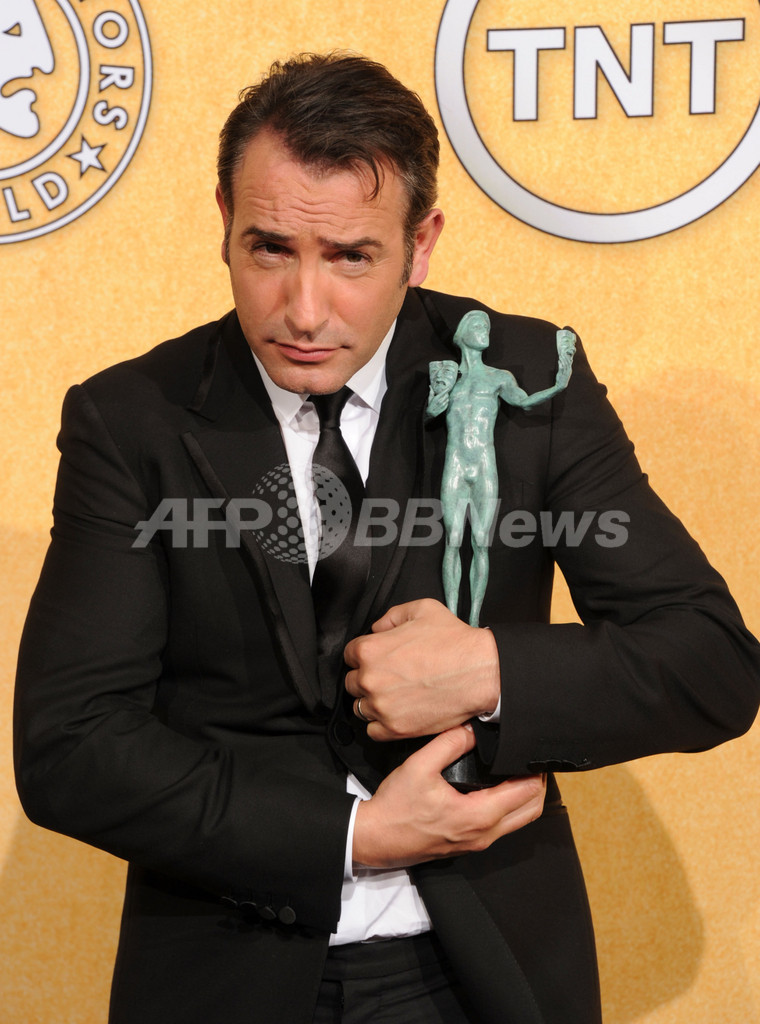 第18回映画俳優組合(Screen Actors Guild、SAG)賞授賞式が29日、米ロサンゼルス(Los Angeles)で開催された。写真は、『アーティスト(The Artist)』で主演男優賞を受賞した俳優ジャン・デュジャルダン(Jean Dujardin、2012年1月29日撮影)。(c)AFP/Getty Images/Jason Merritt