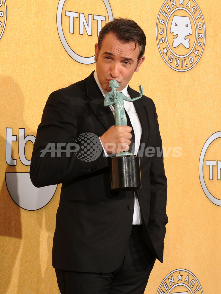 第18回映画俳優組合(Screen Actors Guild、SAG)賞授賞式が29日、米ロサンゼルス(Los Angeles)で開催された。写真は、『アーティスト(The Artist)』で主演男優賞を受賞した俳優ジャン・デュジャルダン(Jean Dujardin、2012年1月29日撮影)。(c)AFP/Getty Images/Jason Merritt