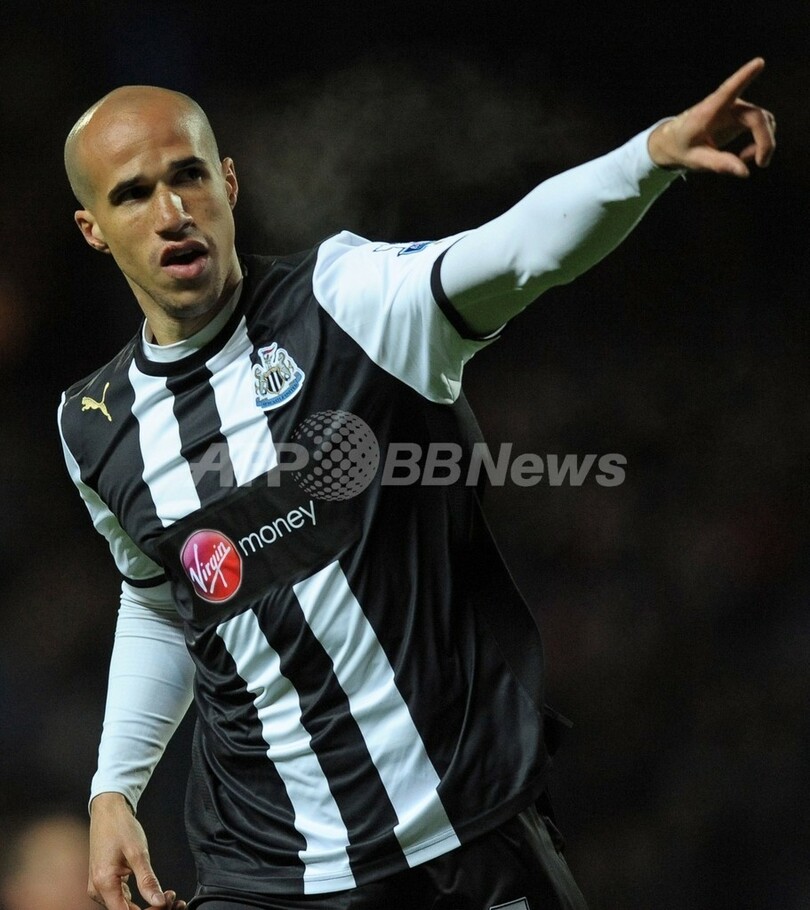 後半ロスタイムに追加点を挙げ、歓喜するニューカッスルのガブリエル・オベルタン(Gabriel Obertan、2012年2月1日撮影)。(c)AFP/PAUL ELLIS