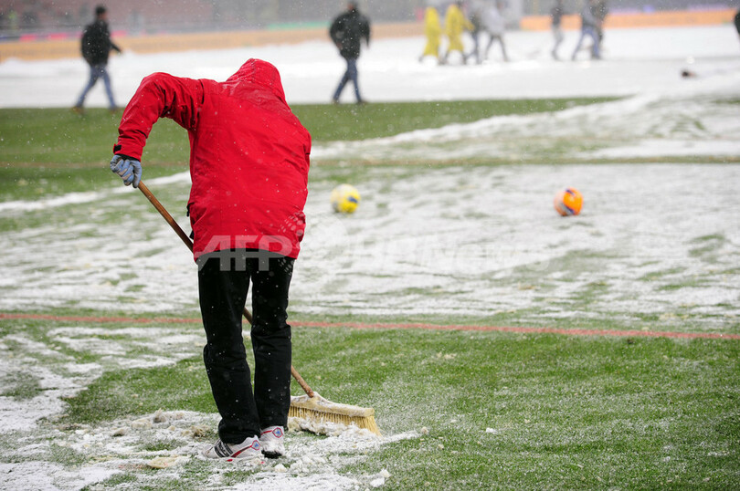 また、アタランタ(Atalanta)対ジェノア(Genoa CFC)、ボローニャ(Bologna FC)対フィオレンティーナ(Fiorentina)、シエナ(AC Siena)対カターニア(Calcio Catania)の3試合が降雪のため中止となった。(c)AFP/Barnaby Chesterman