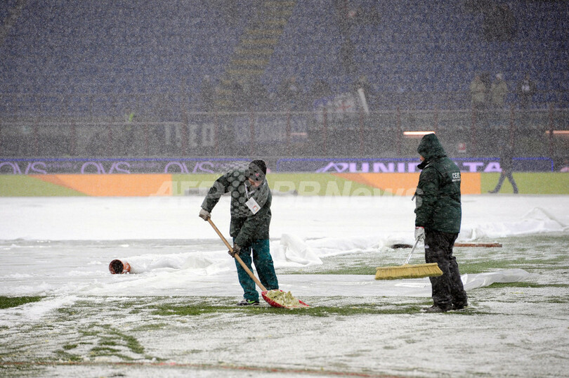 また、アタランタ(Atalanta)対ジェノア(Genoa CFC)、ボローニャ(Bologna FC)対フィオレンティーナ(Fiorentina)、シエナ(AC Siena)対カターニア(Calcio Catania)の3試合が降雪のため中止となった。(c)AFP/Barnaby Chesterman