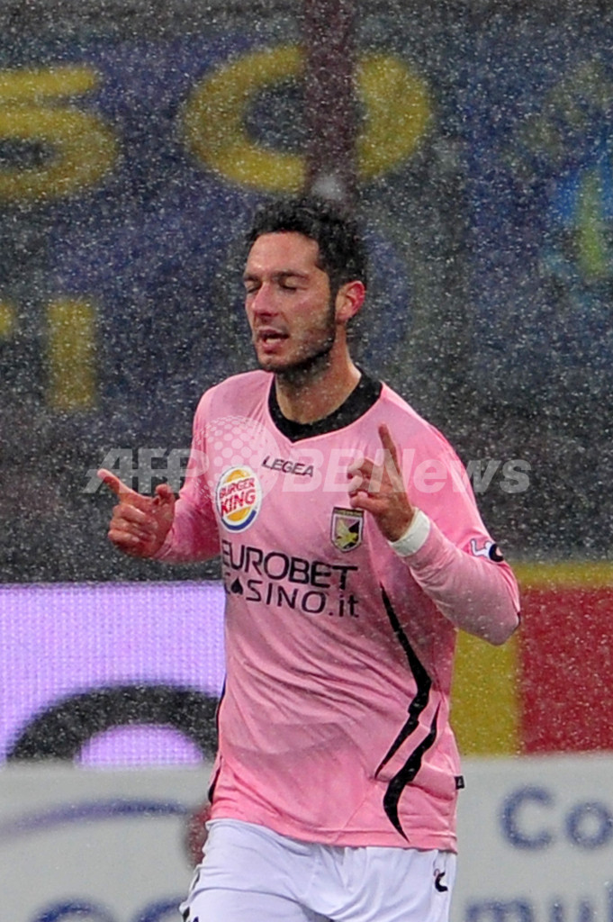 前半17分に先制点を挙げ、歓喜するパレルモのアンドレア・マントバーニ(Andrea Mantovani、2012年2月1日撮影)。(c)AFP/GIUSEPPE CACACE