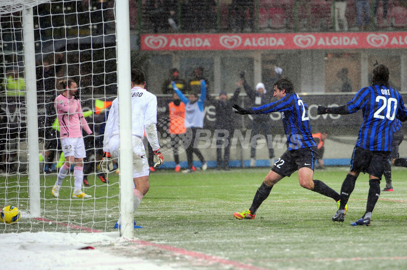 また、アタランタ(Atalanta)対ジェノア(Genoa CFC)、ボローニャ(Bologna FC)対フィオレンティーナ(Fiorentina)、シエナ(AC Siena)対カターニア(Calcio Catania)の3試合が降雪のため中止となった。(c)AFP/Barnaby Chesterman