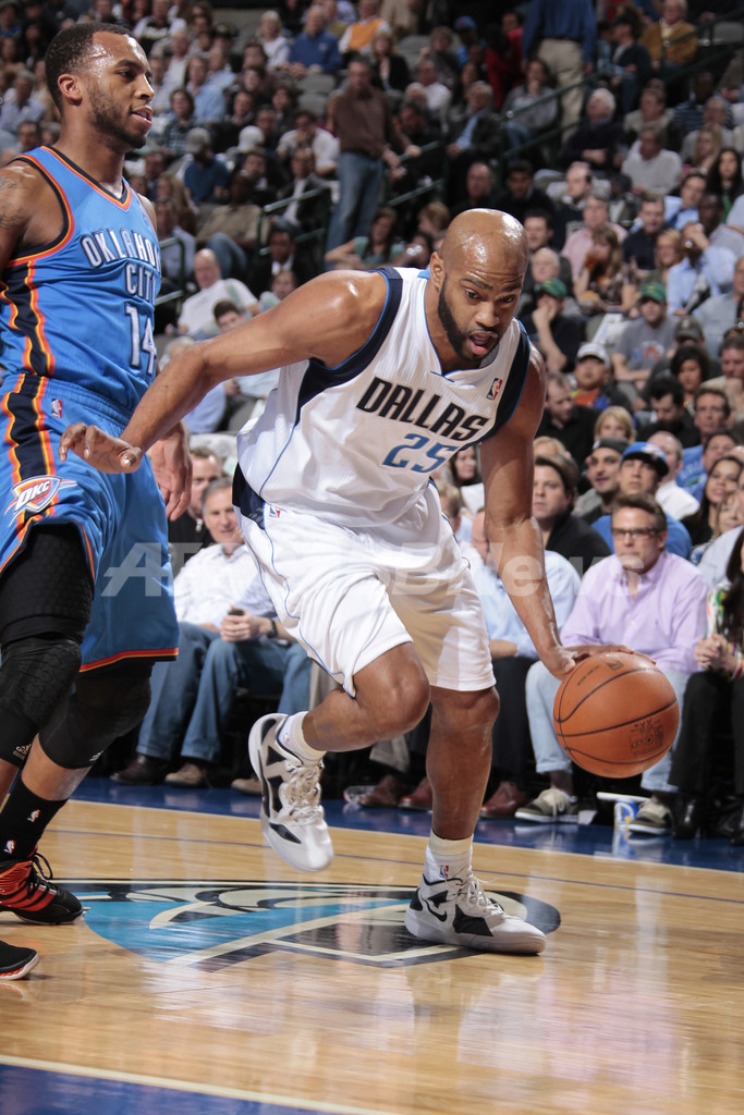 サンダーのデカン・クック(Daequan Cook、左)にドライブを仕掛けるマーベリックスのビンス・カーター(Vince Carter、2012年2月1日撮影)。(c)AFP/Getty Images/NBAE//Danny Bollinger