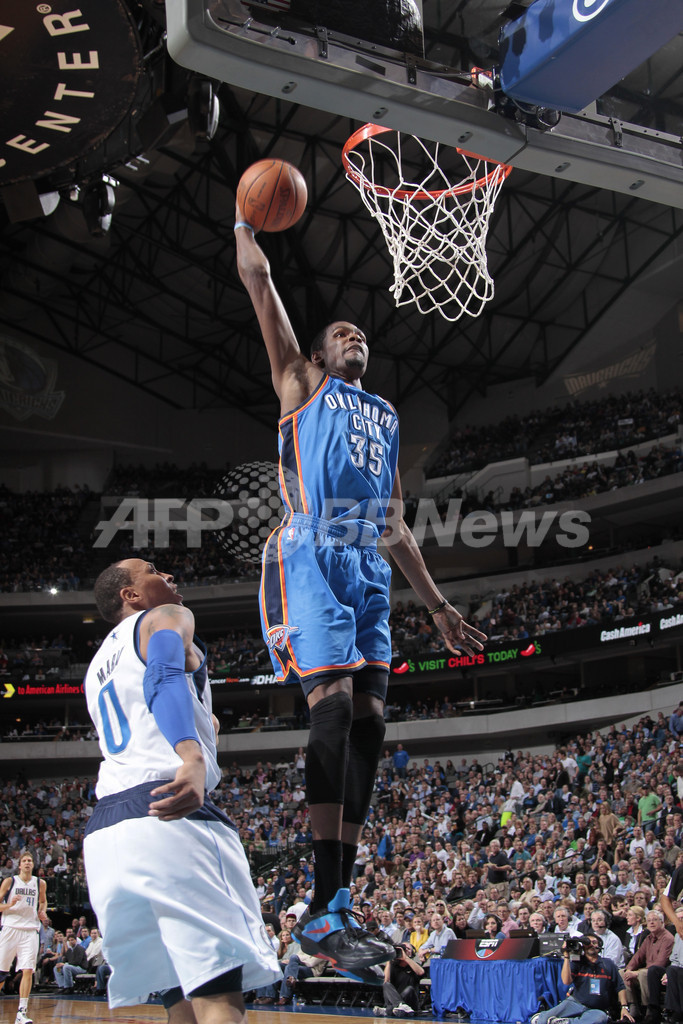 ダンクシュートを狙うサンダーのケビン・デュラント(Kevin Durant、2012年2月1日撮影)。(c)AFP/Getty Images/NBAE//Danny Bollinger