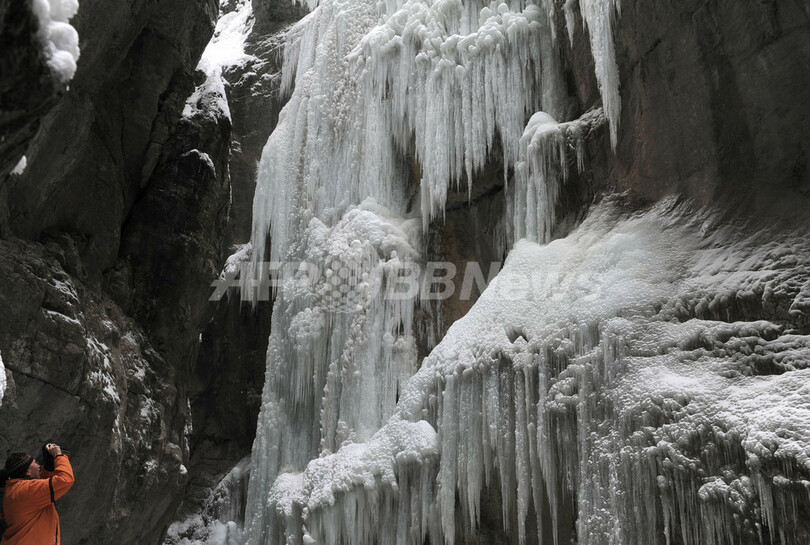 写真は、ドイツ南部ガルミッシュ・パルテンキルヘン(Garmisch-Partenkirchen)近郊のパルトナッハ峡谷(Partnachklamm)で、つららを撮影する男性(2012年2月2日撮影)。(c)AFP/ CHRISTOF STACHE