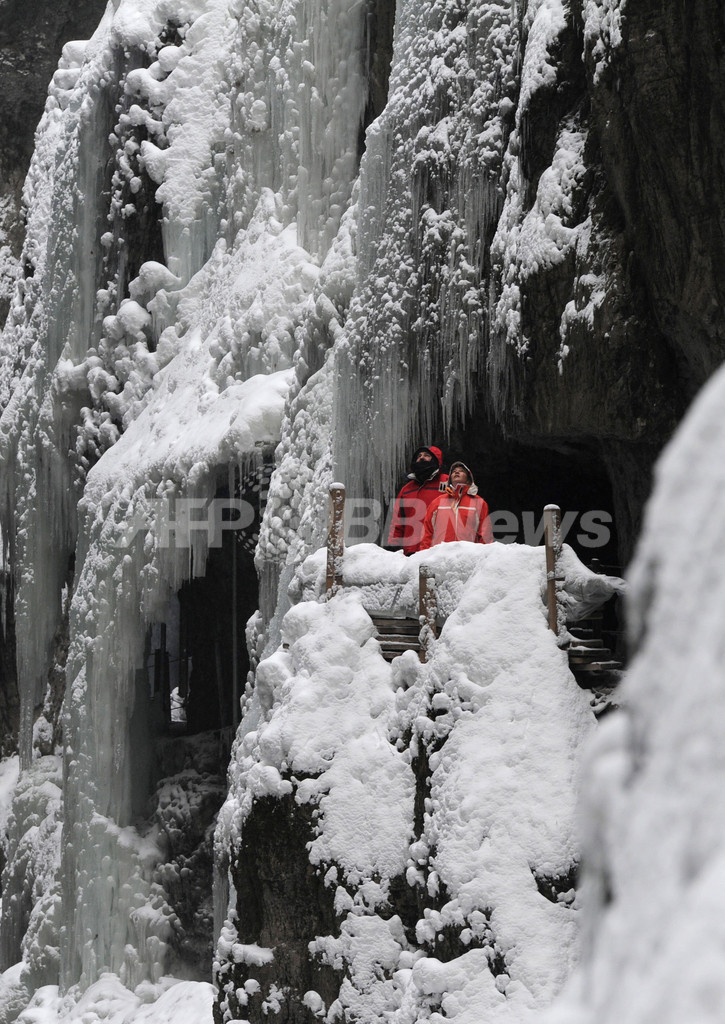 写真は、ドイツ南部ガルミッシュ・パルテンキルヘン(Garmisch-Partenkirchen)近郊のパルトナッハ峡谷(Partnachklamm)で、つららを見上げる人たち(2012年2月2日撮影)。(c)AFP/ CHRISTOF STACHE