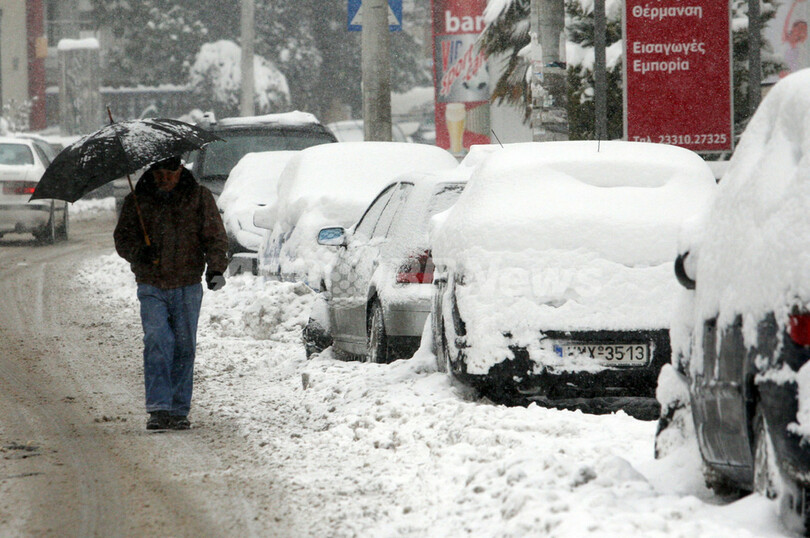 写真は、ギリシャ北部ベリア(Veria)で、雪が降り積もった道路(2012年2月2日撮影)。(c)AFP/Sakis Mitrolidis