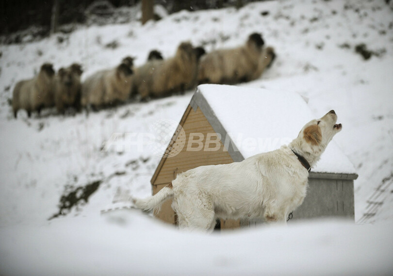 写真は、スペイン北部バスク(Basque)地方のオケンド(Oquendo)で、雪が降り積もった農場のヒツジの群れと牧羊犬(2012年2月2日撮影)。(c)AFP/RAFA RIVAS