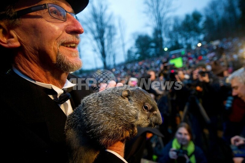【2月3日 AFP】地リスの一種グラウンドホッグ(別名ウッドチャック)が春の到来を占う「グラウンドホッグデー(Groundhog Day)」――毎年恒例のこの行事が2日、米ペンシルベニア(Pennsylvania)州パンクサトーニー(Punxsutawney)で行われた。