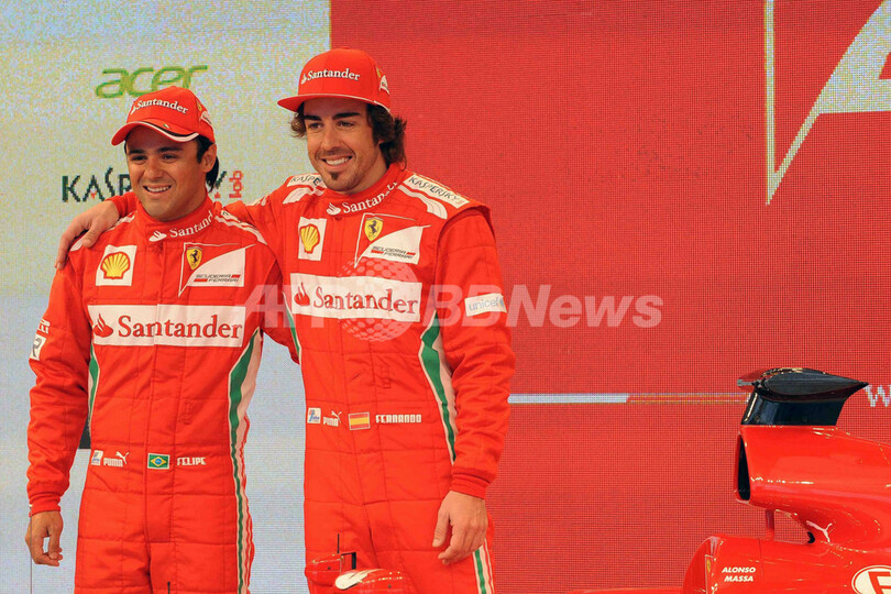 マラネロで行われた新型車「F2012」の発表会見に出席したフェラーリのフェリペ・マッサ(Felipe Massa、左)とフェルナンド・アロンソ(Fernando Alonso、2012年2月3日撮影)。(c)AFP/FERRARI PRESS OFFICE
