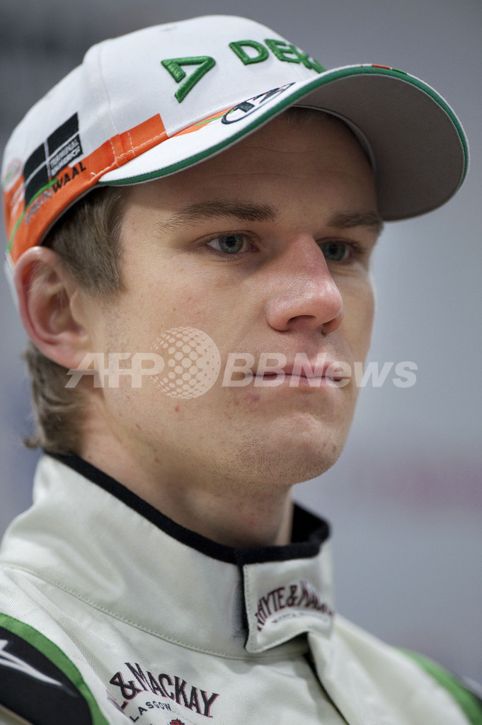 新車発表会見に出席したフォースインディアのニコ・ヒュルケンベルグ(Nico Hulkenberg、2012年2月3日撮影)。(c)AFP/BEN STANSALL