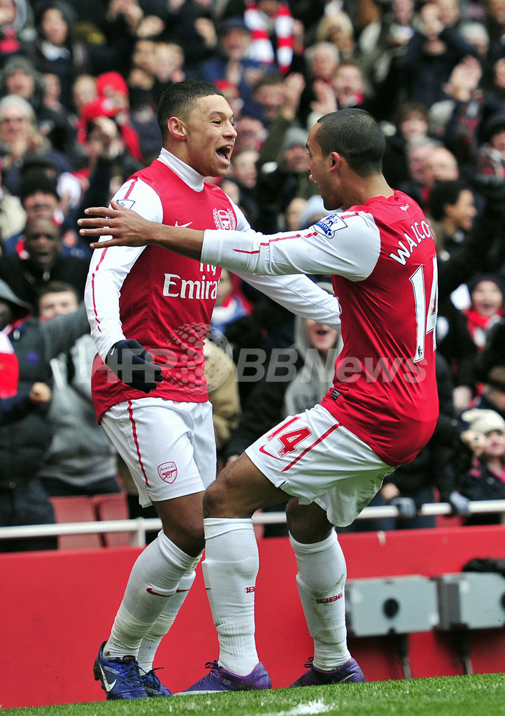 前半40分にチーム3得点目を挙げ、チームメイトのテオ・ウォルコット(Theo Walcott、右)とともに歓喜するアーセナルのアレックス・オックスレイド・チェンバレン(Alex Oxlade- Chamberlain、2012年2月4日撮影)。(c)AFP/GLYN KIRK