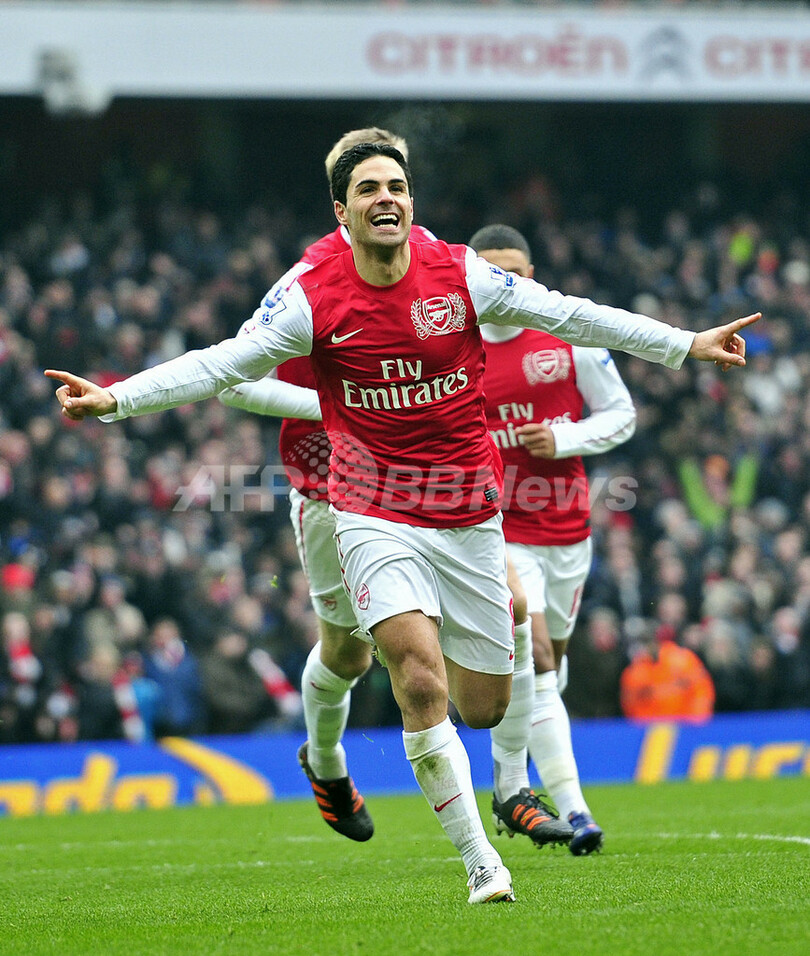後半6分にチーム4得点目を挙げて歓喜するアーセナルのミケル・アルテタ(Mikel Arteta、2012年2月4日撮影)。(c)AFP/GLYN KIRK