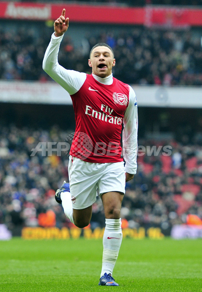 後半9分にチーム5得点目を挙げて歓喜するアーセナルのアレックス・オックスレイド・チェンバレン(Alex Oxlade- Chamberlain、2012年2月4日撮影)。(c)AFP/GLYN KIRK