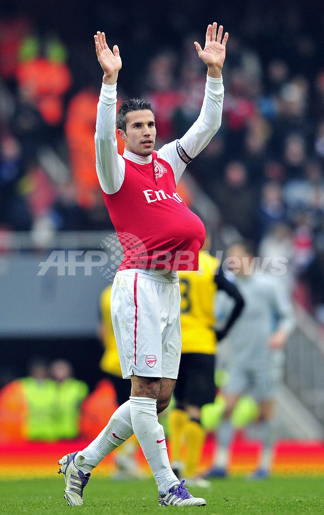 ハットトリックを達成したボールをシャツの中に入れて観衆の声援に応えるアーセナルのロビン・ファン・ペルシー(Robin Van Persie、2012年2月4日撮影)。(c)AFP/GLYN KIRK