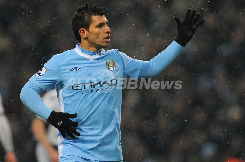 前半10分に先制点を挙げて歓喜するマンチェスター・シティのセルヒオ・アグエロ(Sergio Aguero、2012年2月4日撮影)。(c)AFP/ANDREW YATES