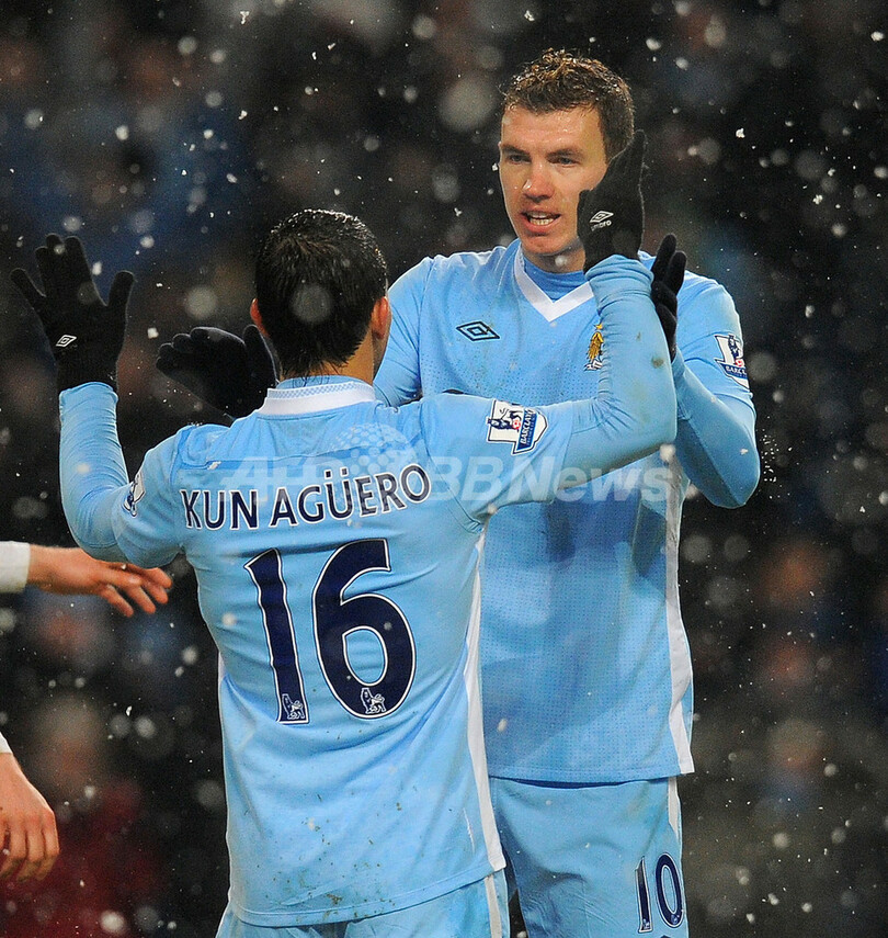 後半27分にチーム3得点目を挙げ、チームメイトのセルヒオ・アグエロ(Sergio Aguero)と喜びを分かち合うマンチェスター・シティのエディン・ジェコ(Edin Dzeko、2012年2月4日撮影)。(c)AFP/ANDREW YATES