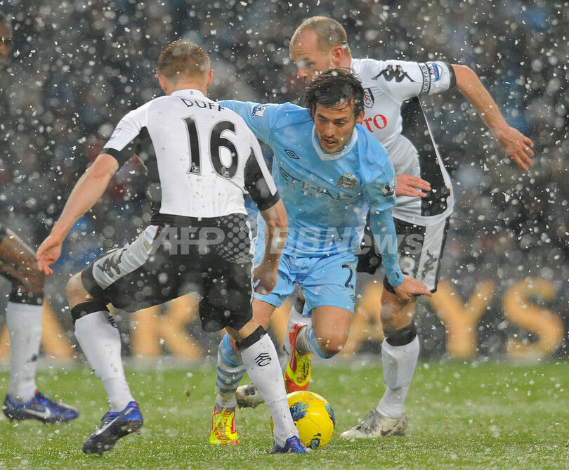 フラムの選手に囲まれるマンチェスター・シティのダビド・シルバ(David Silva、2012年2月4日撮影)。(c)AFP/ANDREW YATES
