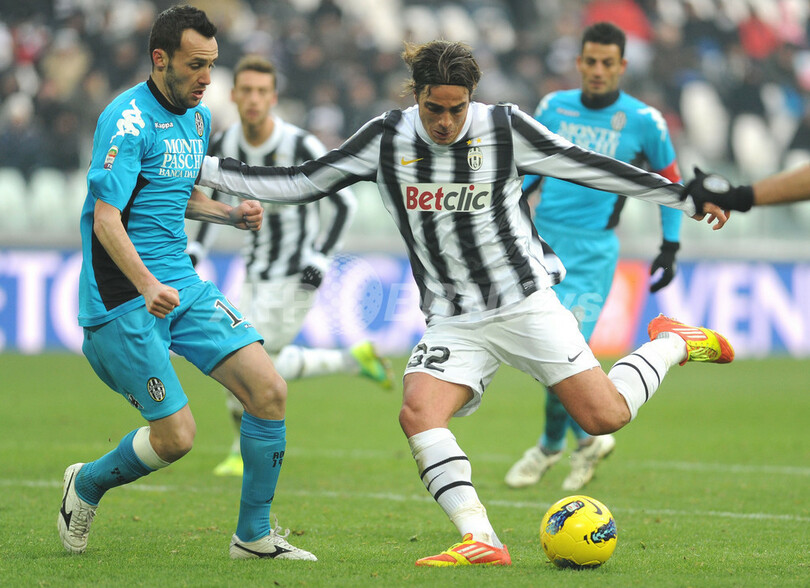 ボールをコントロールするユベントスのアレッサンドロ・マトリ(Alessandro Matri、中央、2012年2月5日撮影)。(c)AFP/Tiziana Fabi
