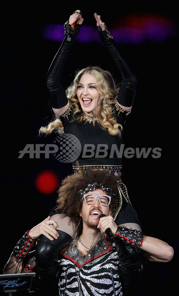 米インディアナ(Indiana)州インディアナポリス(Indianapolis)のルーカス・オイル・スタジアム(Lucas Oil Stadium)で行われた第46回スーパーボウル(Super Bowl XLVI)のハーフタイムショーに、米歌手マドンナ(Madonna)が出演した(2012年2月5日撮影)。(c)AFP/Getty Images/Ezra Shaw