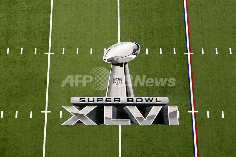 フィールドに描かれた第46回スーパーボウルのロゴ(2012年2月5日撮影)。(c)AFP/Getty Images/Andy Lyons