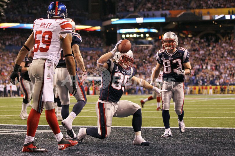 第2Qにタッチダウンを決め歓喜するペイトリオッツのダニー・ウッドヘッド(Danny Woodhead、中央、2012年2月5日撮影)。(c)AFP/Getty Images/Jamie Squire