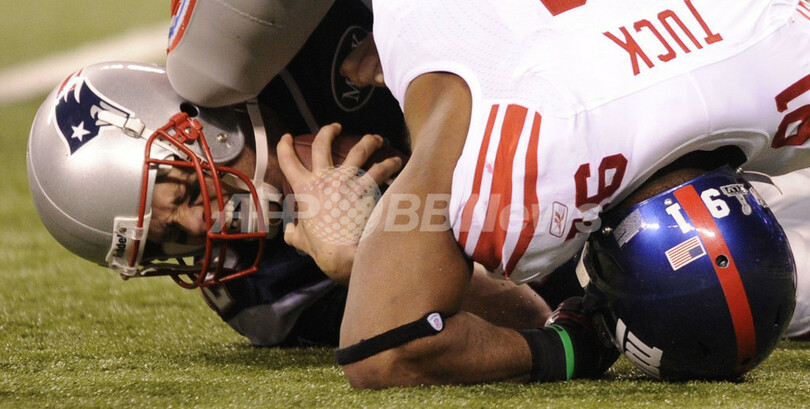 ジャイアンツのジャスティン・タック(Justin Tuck、右)にサックされるペイトリオッツのQBトム・ブレイディ(Tom Brady、2012年2月5日撮影)。(c)AFP/TIMOTHY A. CLARY