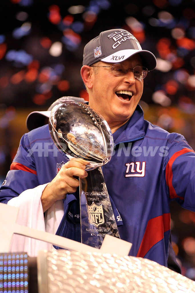 表彰式でヴィンス・ロンバルディ・トロフィー(Vince Lombardi Trophy)を掲げるジャイアンツのトム・コフリンHC(Tom Coughlin、2012年2月5日撮影)。(c)AFP/Getty Images/Jamie Squire