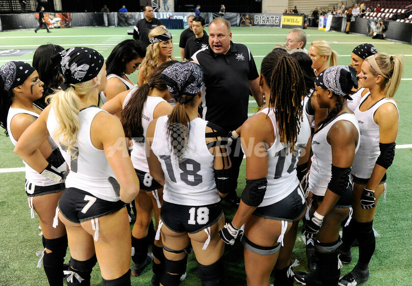 米ネバダ(Nevada)州ラスベガス(Las Vegas)で6日、下着姿の女性がアメリカンフットボールをするランジェリーフットボールリーグ(Lingerie Football League)の優勝決定戦「第9回ランジェリー・ボウル(Lingerie Bowl)」が開催された。ロサンゼルス・テンプテーョン(Los Angeles Temptation)がフィラデルフィア・パッション(Philadelphia Passion)を28-6で下し、優勝した。写真は、試合開始を待つロサンゼルスの選手ら(2012年2月5日撮影)。(c)AFP/Getty Images/Ethan Miller