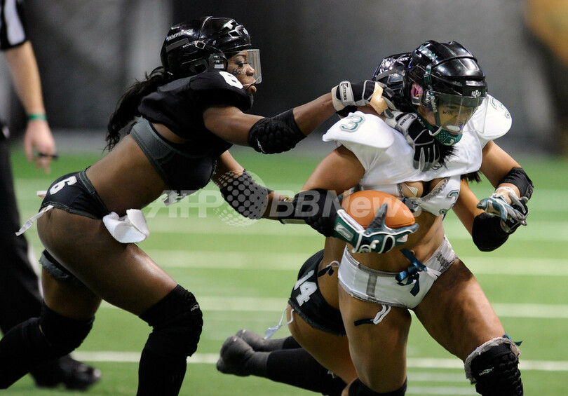 米ネバダ(Nevada)州ラスベガス(Las Vegas)で6日、下着姿の女性がアメリカンフットボールをするランジェリーフットボールリーグ(Lingerie Football League)の優勝決定戦「第9回ランジェリー・ボウル(Lingerie Bowl)」が開催された。ロサンゼルス・テンプテーョン(Los Angeles Temptation)がフィラデルフィア・パッション(Philadelphia Passion)を28-6で下し、優勝した。写真は、試合の一場面(2012年2月5日撮影)。(c)AFP/Getty Images/Ethan Miller