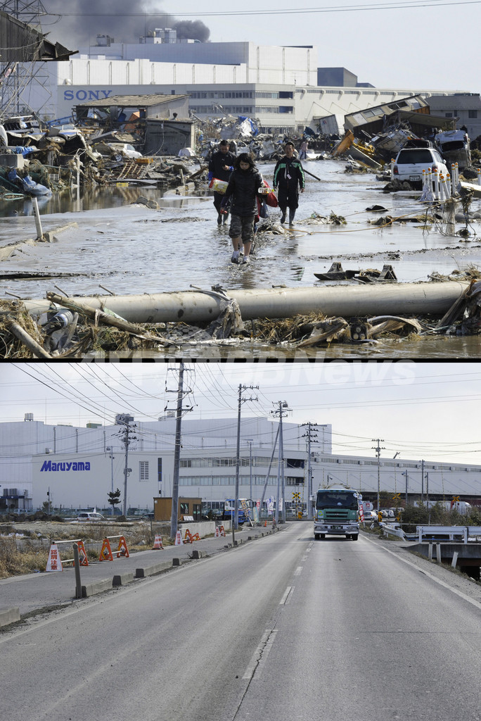 ニュース 社会 【写真特集】東日本大震災、被災地の震災直後と今 2012年3月8日 19:57 発信地:日本 [ アジア・オセアニア 日本 ] このニュースをシェア ‹ › ❮ 20/38 ❯ 東日本大震災の被災地の震災直後の様子と、2012年1月の様子。写真上は津波被害を受けた宮城県多賀城市で冠水した道路を歩く住民(2011年3月13日撮影)。写真下は現在の様子(2012年1月13日撮影)。(c)AFP/KAZUHIRO NOGI/TORU YAMANAKA 画像作成中 ! 【2月7日 AFP】東日本大震災の被災地の震災直後の様子と、2012年1月の様子。(c)AFP 社会 一覧へ> メディア・報道関係・法人の方向け 写真・動画 購入のお問合せ>
