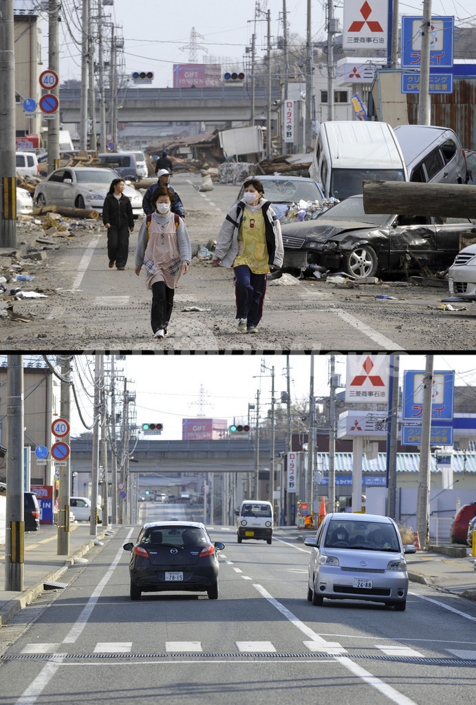 ニュース 社会 【写真特集】東日本大震災、被災地の震災直後と今 2012年3月8日 19:57 発信地:日本 [ アジア・オセアニア 日本 ] このニュースをシェア ‹ › ❮ 16/38 ❯ 東日本大震災の被災地の震災直後の様子と、2012年1月の様子。写真上は岩手県大船渡市で津波被害を受けた街路(2011年3月14日撮影)。写真下は現在の様子(2012年1月15日撮影)。(c)AFP/TOSHIFUMI KITAMURA /TORU YAMANAKA 画像作成中 ! 【2月7日 AFP】東日本大震災の被災地の震災直後の様子と、2012年1月の様子。(c)AFP 社会 一覧へ> メディア・報道関係・法人の方向け 写真・動画 購入のお問合せ>