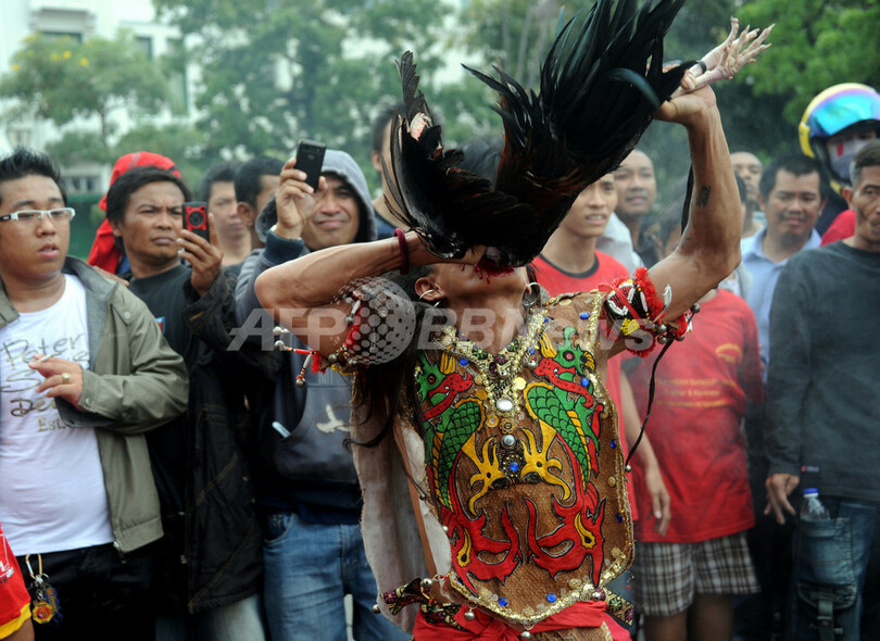 ニュース ライフ 春節の終わり祝うシャーマンの儀式、インドネシア 2012年2月7日 15:06 発信地:ジャカルタ/インドネシア [ アジア・オセアニア インドネシア ] このニュースをシェア ‹ › ❮ 13/13 ❯ インドネシアの首都ジャカルタ(Jakarta)で6日、春節(旧正月、Lunar New Year)を締めくくる「元宵節(Cap Go Meh)」の祭りが開催され、部族のシャーマンたちが登場した。写真はおんどりの血を飲むサンバス(Sambas)部族のシャーマン(2012年2月6日撮影)。(c)AFP/ADEK BERRY 画像作成中 ! 【2月7日 AFP】インドネシアの首都ジャカルタ(Jakarta)で6日、春節(旧正月、Lunar New Year)を締めくくる「元宵節(Cap Go Meh)」の祭りが開催され、部族のシャーマンたちが登場した。(c)AFP ライフ 一覧へ> メディア・報道関係・法人の方向け 写真・動画 購入のお問合せ>